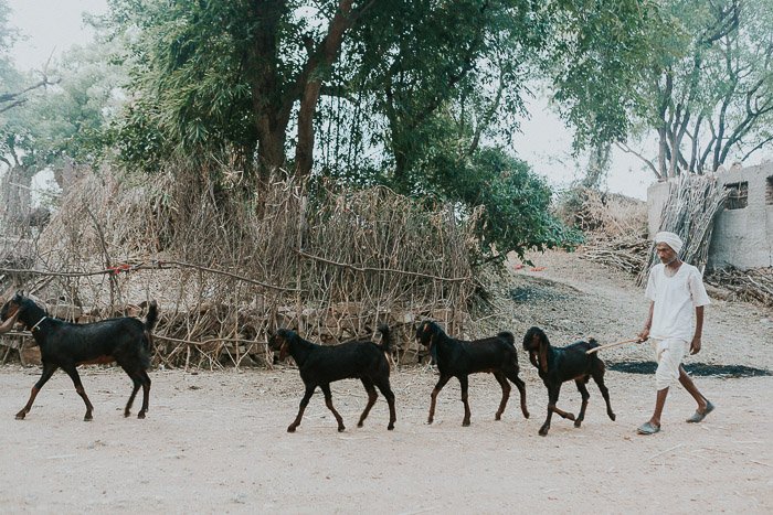 Travel photography of a herd of black goats walking down a road in India.